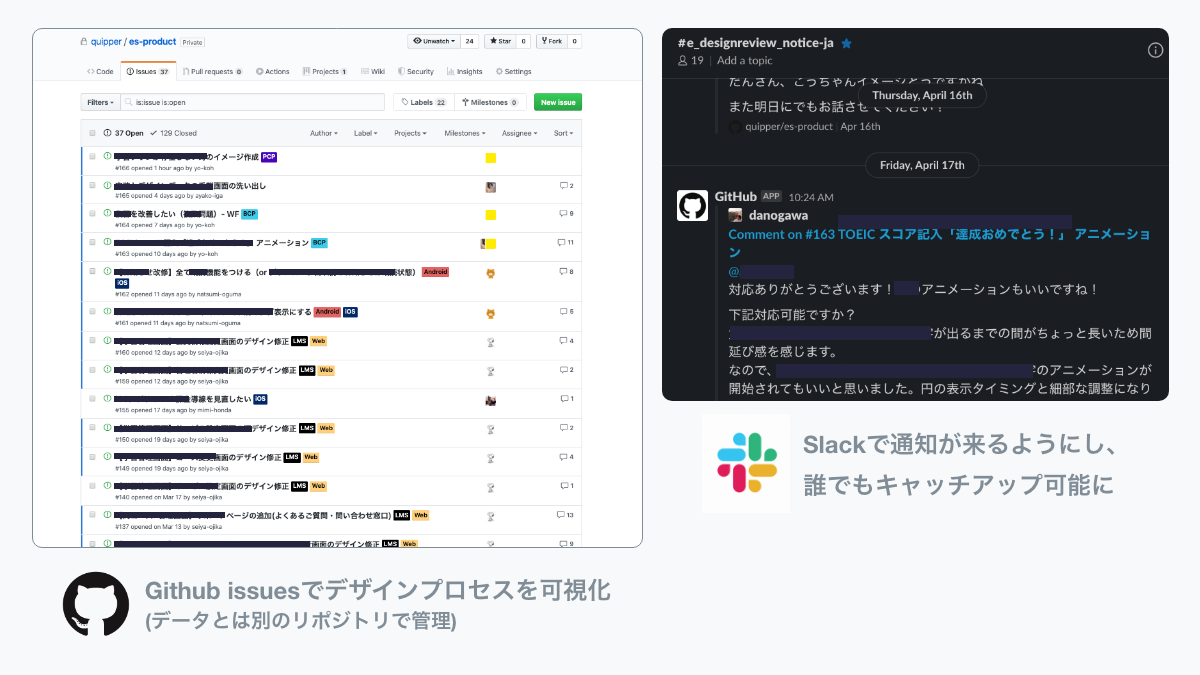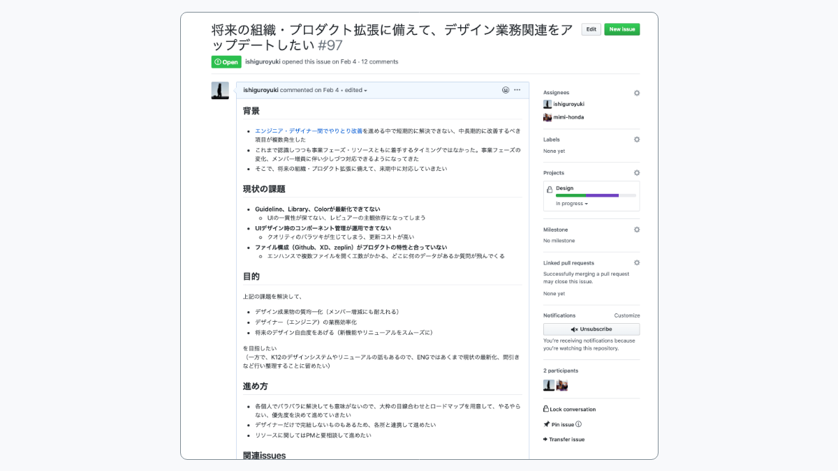 具体的には、各自ローカルで行ってたいモノたちを、Github issuesに集約し可視化することを行いました。検討履歴やデザインプロセスが誰でも見え、意見を言えるような状態になりました。結果的に風通しもよくなったため、フラットにデザイナー同士で相談する文化もできてきました。