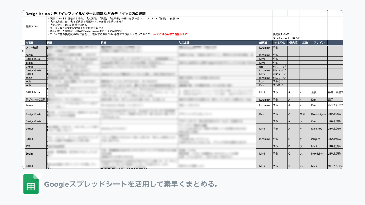 一番最初に「デザイン業務・仕様検討の可視化」を導入しました。これまでデザイン業務が各メンバーでブラックボックスになってしまい、良いナレッジや改善点など見え辛い状態でした。 ここの風通しを良くすることが、お互いに取り組んでいるデザインに意見を出し合えたり、業務改善できるポイントを発見しやすくなると考え、最初に取り組みました。