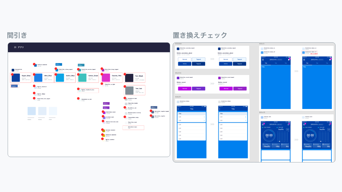 間引きと並行に、置き換えを検討していきました。colorごとに利用されている画面をチェックし、置き換えた際に違和感がないか確認していきました。