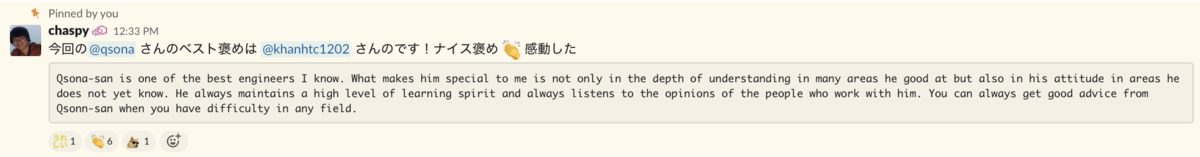 なお、その日の「ベスト褒め」を @chaspy が勝手に選び、額縁に飾られます。(Slack 上でピン留めされます)