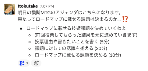 もしそれで良いとなったらMTGの進行がスムーズになるし、ダメならダメで代わりにどうするかの意見がメンバーから出しやすくなります。
