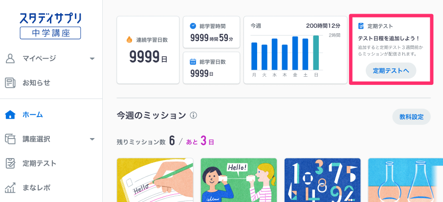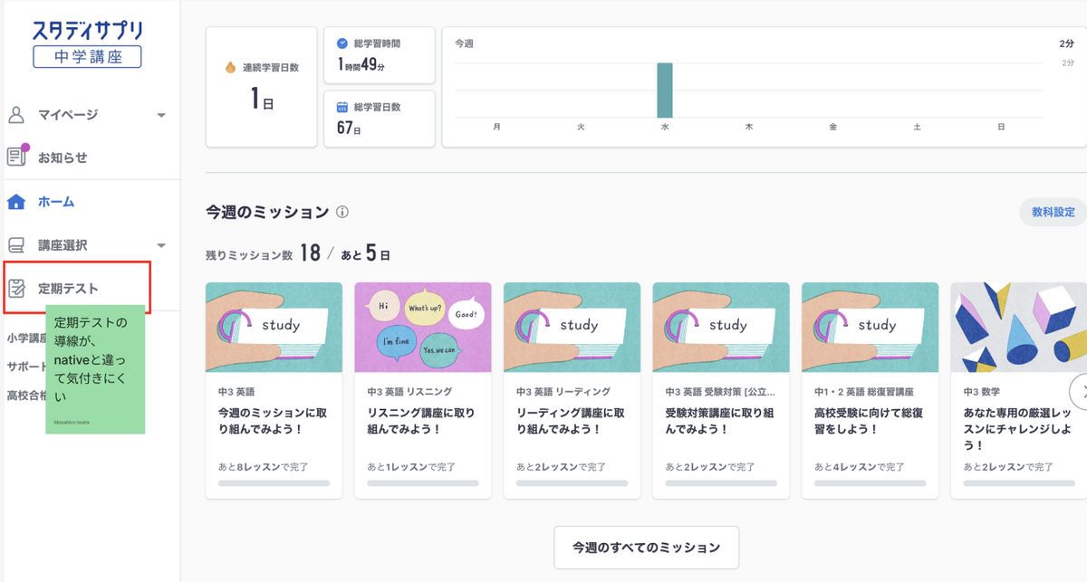 定期テストは中学生ユーザにとって非常に重要なイベントであり、ここで点数を取ることをプロダクトとしても重要視しています。スタディサプリ中学講座では定期テストの期間を入力し、その期間に応じて定期テスト向けの特別なコンテンツをミッションで訴求する機能が存在します。しかし、Web のユーザは Native に対して定期テストの利用率が低いという分析結果がありました。その理由として、定期テストへの導線はグローバルナビゲーションにしか存在しないため、認知されていないのでは、という仮説を検証するために、ホーム画面上部に定期テストへの動線を追加する A/B テストを実施しました。