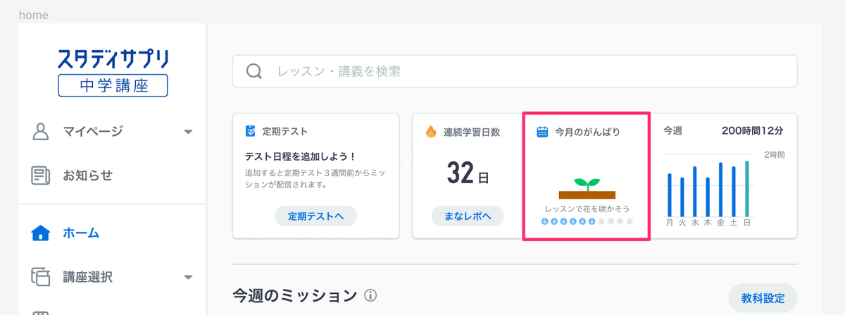 *3:おすすめレッスンを示すミッション機能、定期テスト日程登録機能、過去の学習統計を提供する”まなレポ"機能、レッスン検索機能など