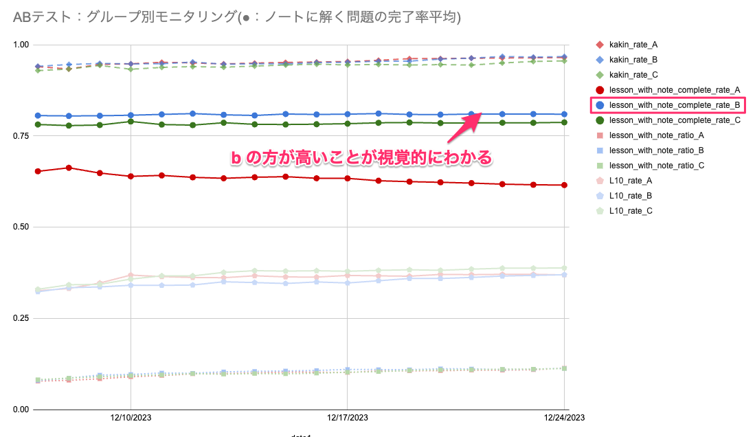 これは 「ノートに解く問題」ラベルをレッスンにつけたい」という施策の結果です。ノートに解く問題の完了率が明らかに差があることが一目でわかります。これを Daily standup でみんなで眺めることで、早期に意思決定することを助けてくれました。