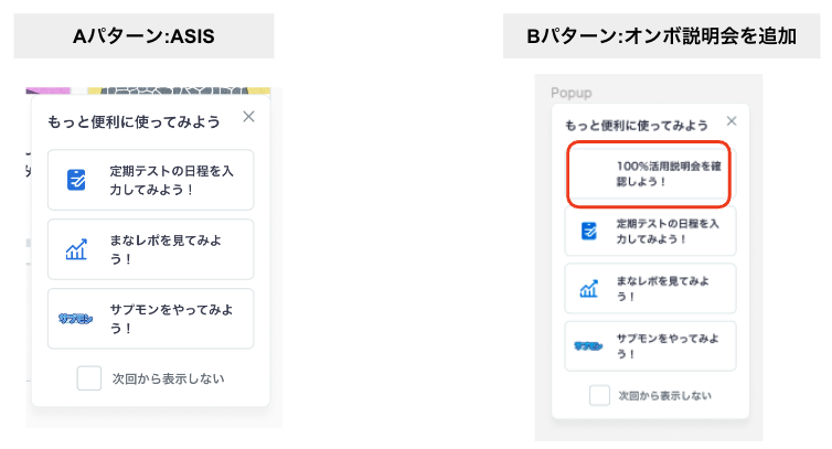 スタディサプリ中学講座には純粋にレッスンを解く機能の他に「定期テスト日程入力」「まなレポ」「サプモン」というユーザにとって有益な機能があります。これらの機能についてもユーザに認知してもらった方がよりプロダクトの利用率が上がるという仮説がありました。そのためオンボーディング期間後にこれらの機能を使ったかどうかを確認するタスクリストを表示する A/B テストを実施しました。