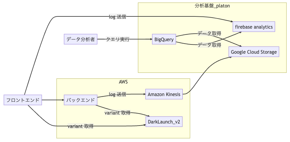 分析を行うために、判定結果をログとしてデータベースに送る必要があります。フロントエンドからは Google Analytics for Firebase にログを送り、分析時は BigQuery 経由でデータを取得しています。