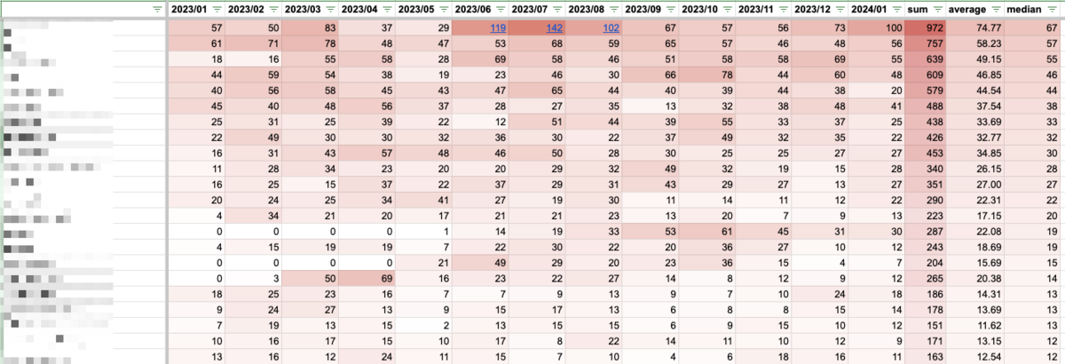 Conditional Format を使ってヒートマップとしました。どのサービスが恒常的に多いのか、あるいは時期的に多いのかを見ることができます。これも四半期ごとに定期的に取得しようと考えています。また、マージされた PR 数は Four Keys のうちの1つのデプロイ頻度や変更のリードタイムの先行指標になる Metrics だと考えます。この観点でも推移を追うと発見があるかもしれませんね。