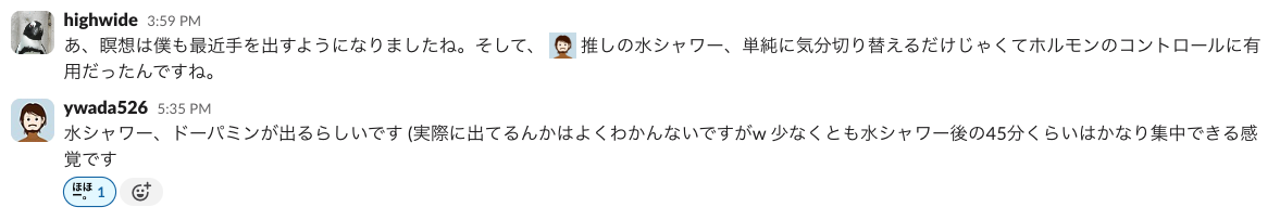 shippitsu-random というchannelが最近できたので、原稿と向き合うためのドーパミンコントロールに「水シャワー」が有効という話を1章担当の @ywada526 としていました。